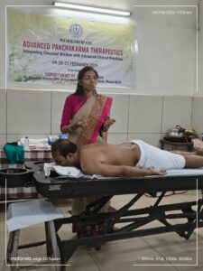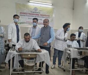 विशेष रूप से वातव्याधियो में अभ्यंग चिकित्सा का महत्व बताया गया।इस अवसर पर पंचकर्म की चिकित्सा का सजीव चित्रण भी किया गया।